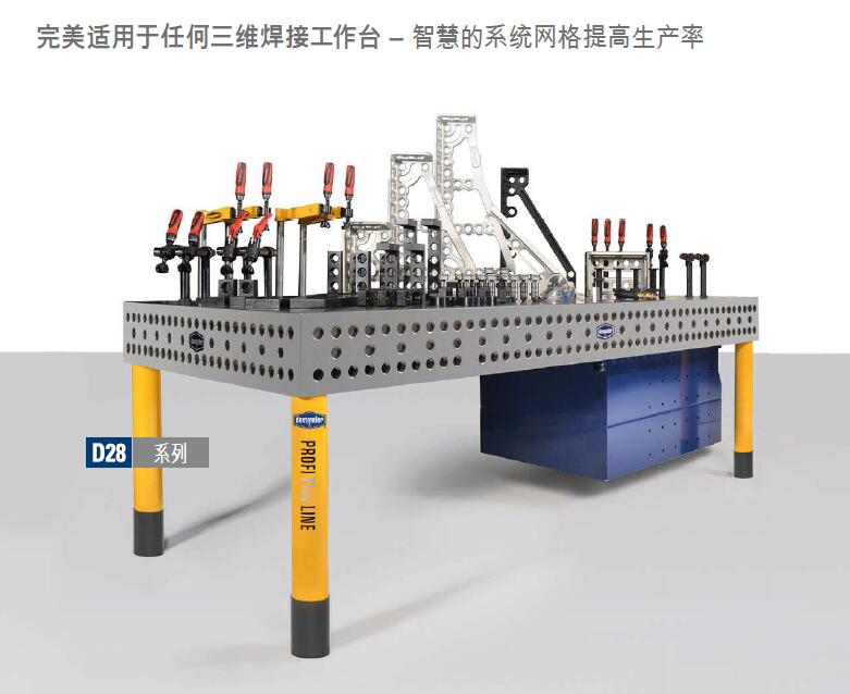 1992年,德国(Demmeler)戴美乐公司经过多年的研制,创造了一种新型的孔系夹紧系统--三维柔性组合夹具,网格孔和标尺用于焊接、机械加工和检测工件。以带有的五个工作面的三维焊接工作台为基础,配备各种用于定位的标准模块,通过快速销栓连接,对于各种形状的工件进行快速、精确的装夹,保证焊接或加工的工件达到很高的精度。三维焊接工作台代替了传统的专用工装,使用户缩短大量的设计、制造时间,并且三维焊接工作台可以反复使用,节约研制和生产成本。