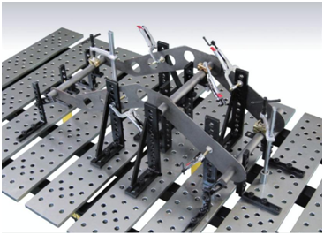 条板拼装型工装,是在框架上间隔拼装条形板,条形板上已加工了均匀分布的系列孔。这种类型的工装成本较低,适合小型、平面型工件的焊接加工。由于条形板拼装而成,刚性较差,精度低,也不便于组合成大型的或者三维的工件使用。